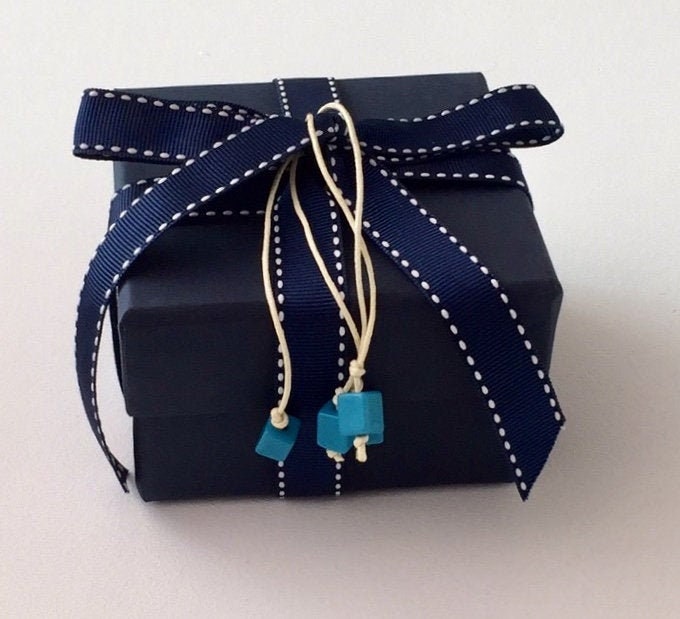 Each one is placed inside a handmade dark blue box with sugared almonds and a tulle and wrapped with a dotted ribbon and light blue beads.