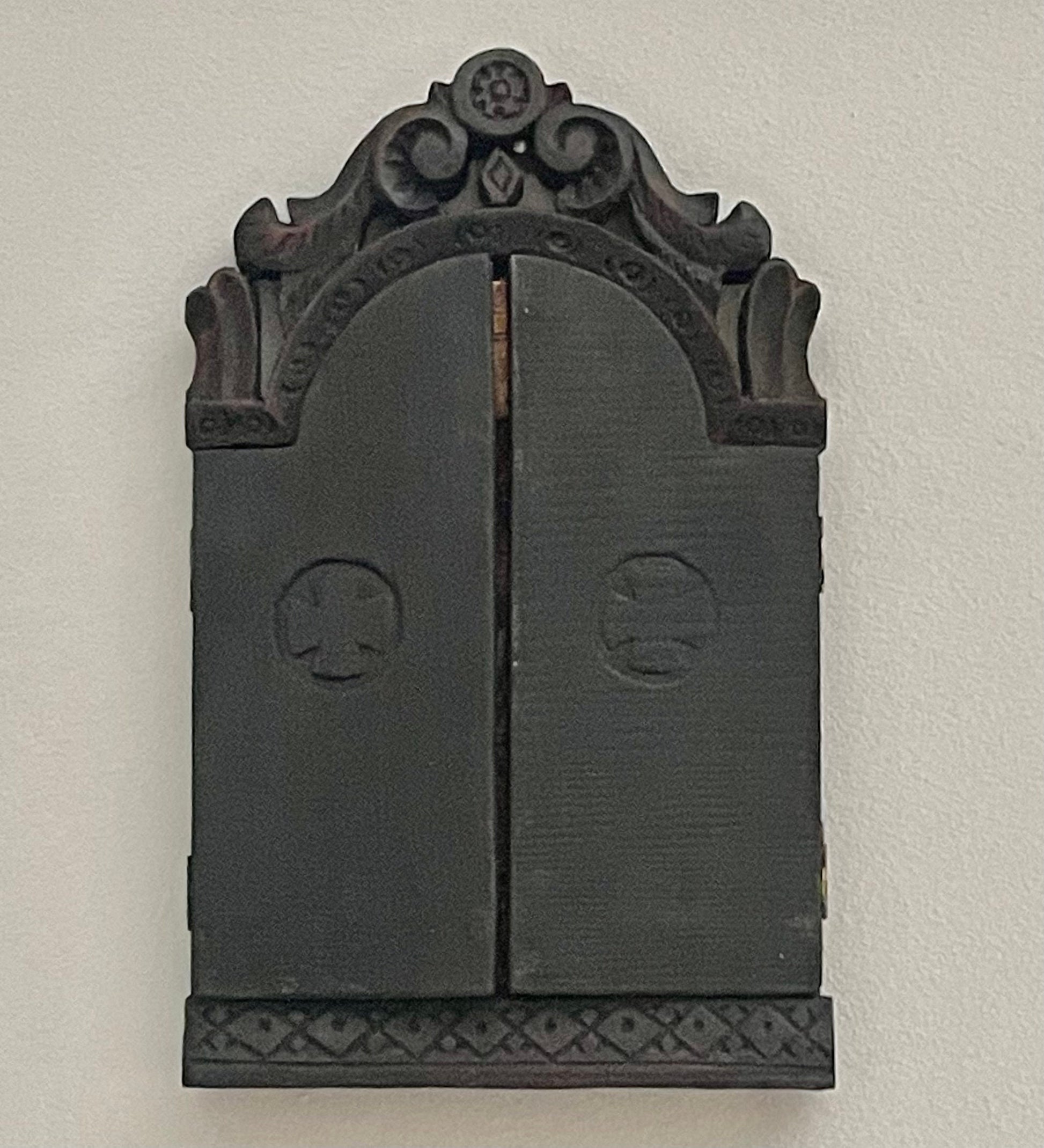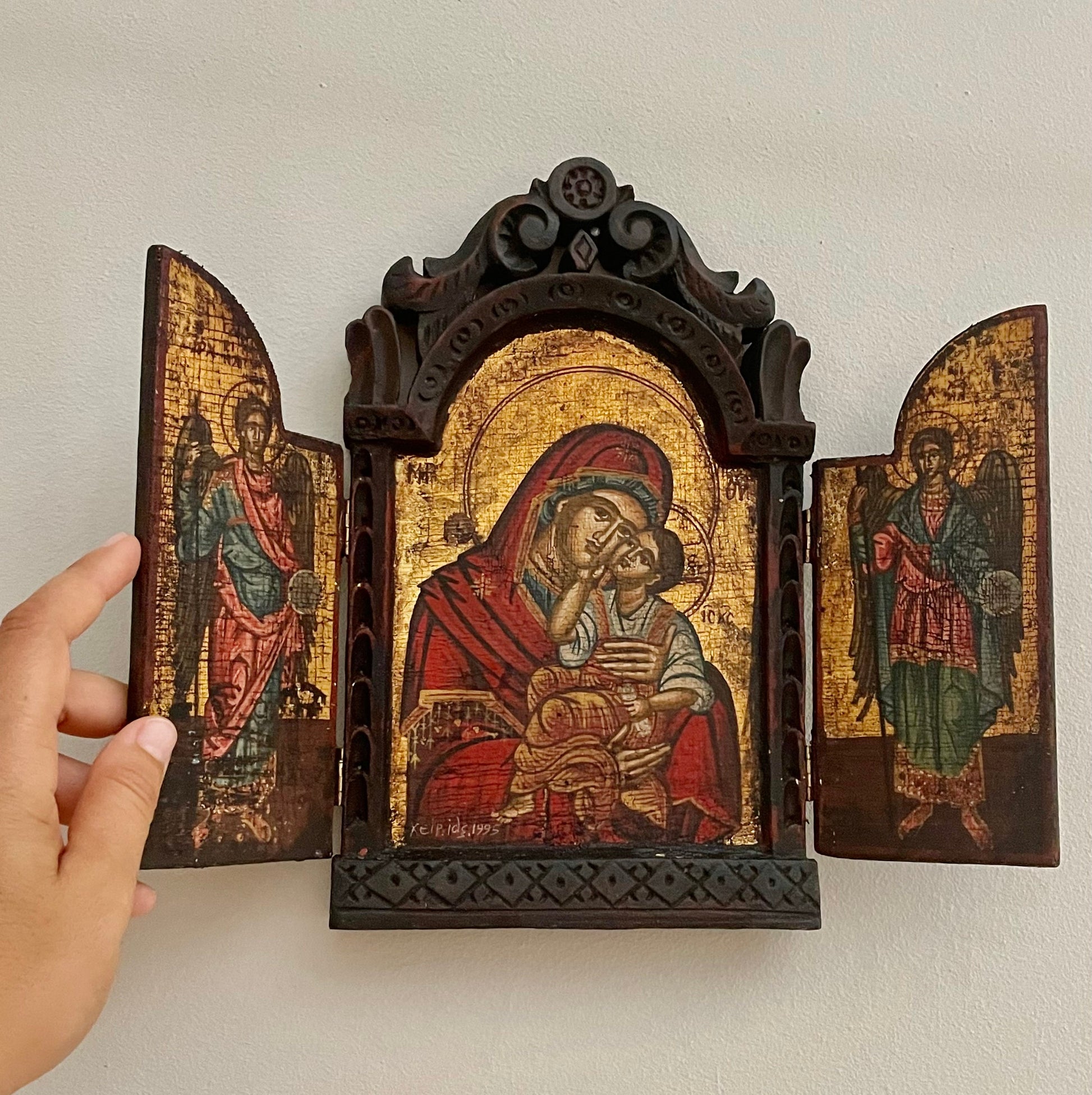 Virgin and Child, two angels on the two windows, Byzantine icon with woodcarved frame
