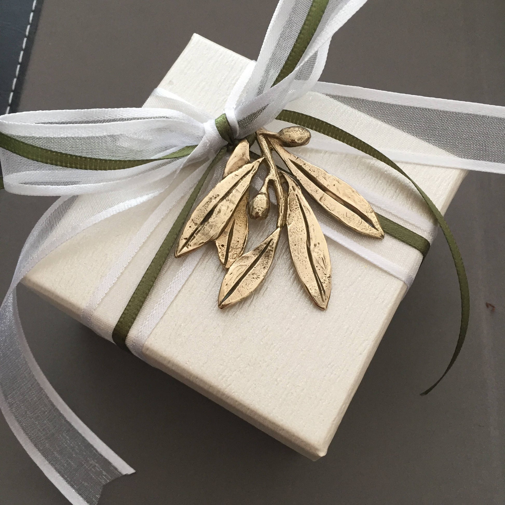 Bronze olive branch wedding favor.Branch tied on a box containing sugared almonds