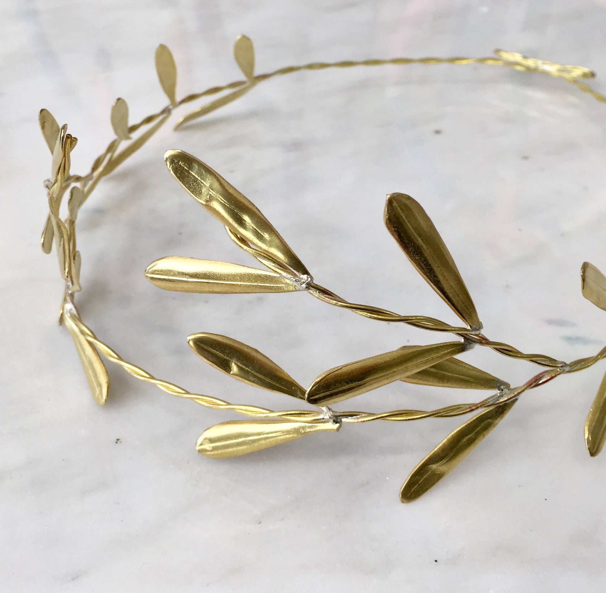 A unique handmade bronze bridal crown with olive leafs that top up in the front.