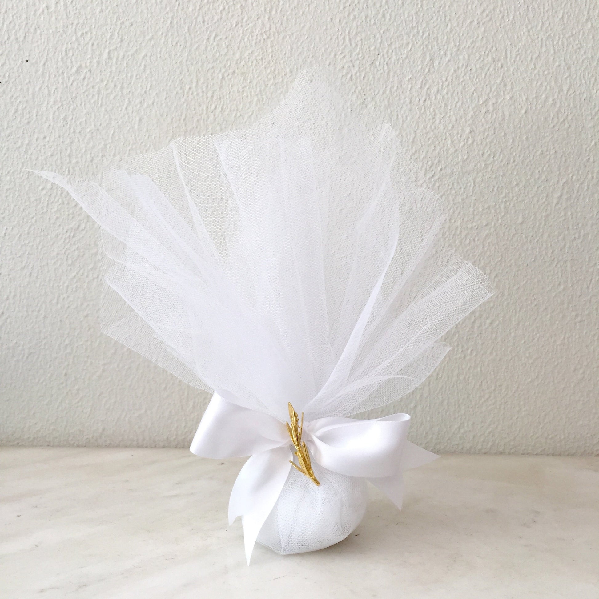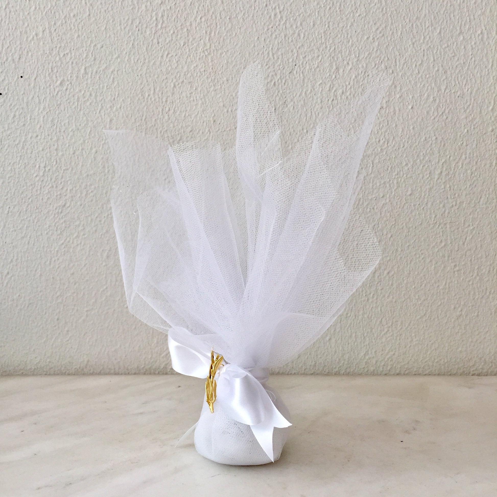 Wedding favor, olive branch, Greek island wedding,raw bronze branch,tulles, satin ribbon,sugared almonds inside, 20 wedding favors